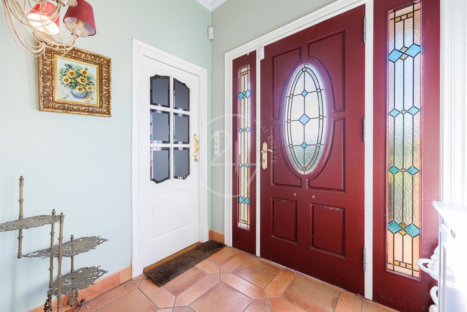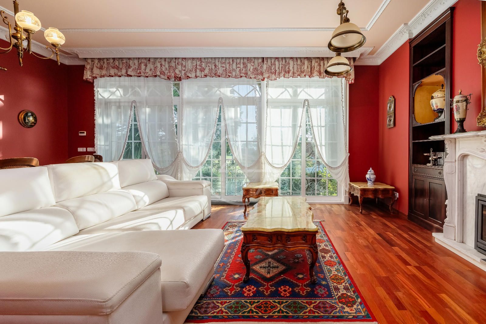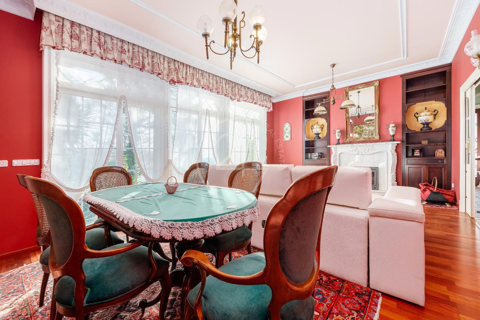 La entrada se realiza a través de un acceso automático que conduce al garaje en la planta semisótano y a un cuidado porche delantero que da la bienvenida a la casa. Una vez dentro, el recibidor conecta con un elegante salón comedor de estilo inglés, que destaca por sus techos altos, una chimenea central y amplios ventanales orientados al campo, creando un ambiente cálido y luminoso durante todo el año. La zona de día se complementa con una práctica cocina comedor, que dispone además de acceso directo a la zona ajardinada, ideal para disfrutar de reuniones familiares al aire libre.