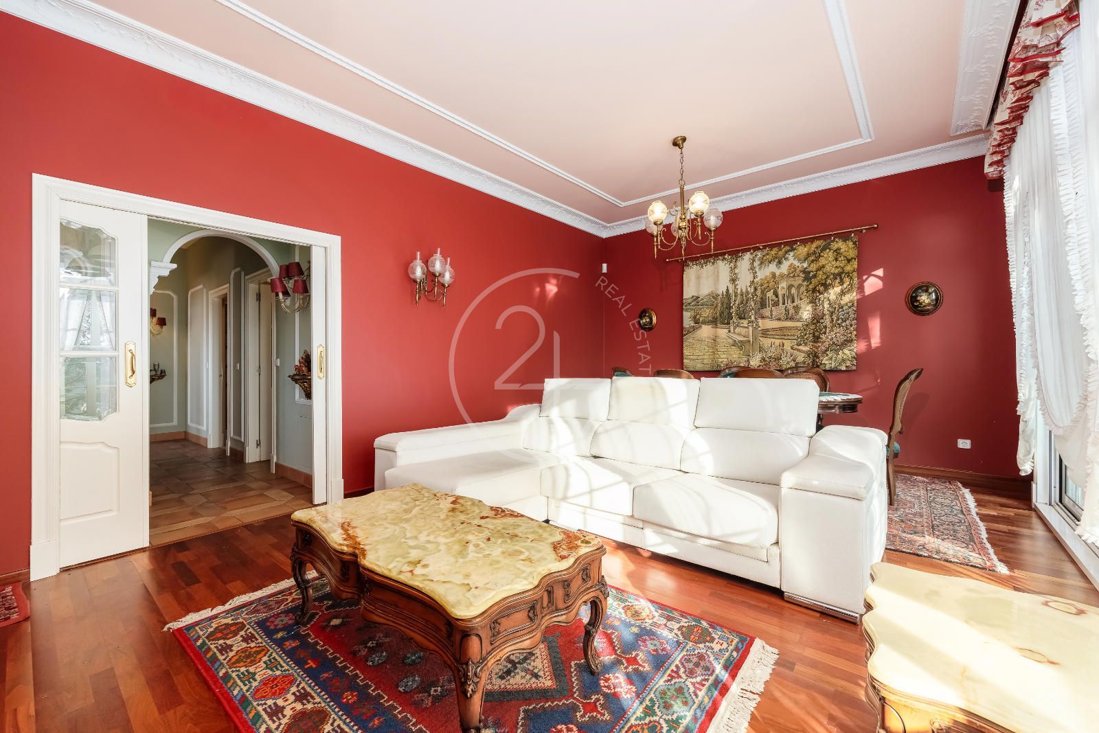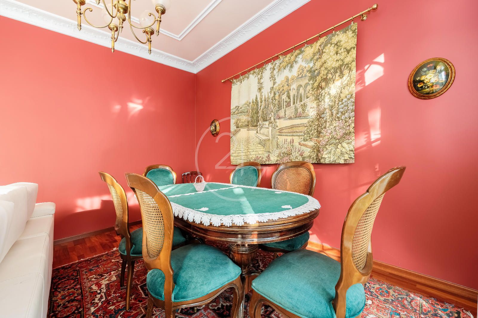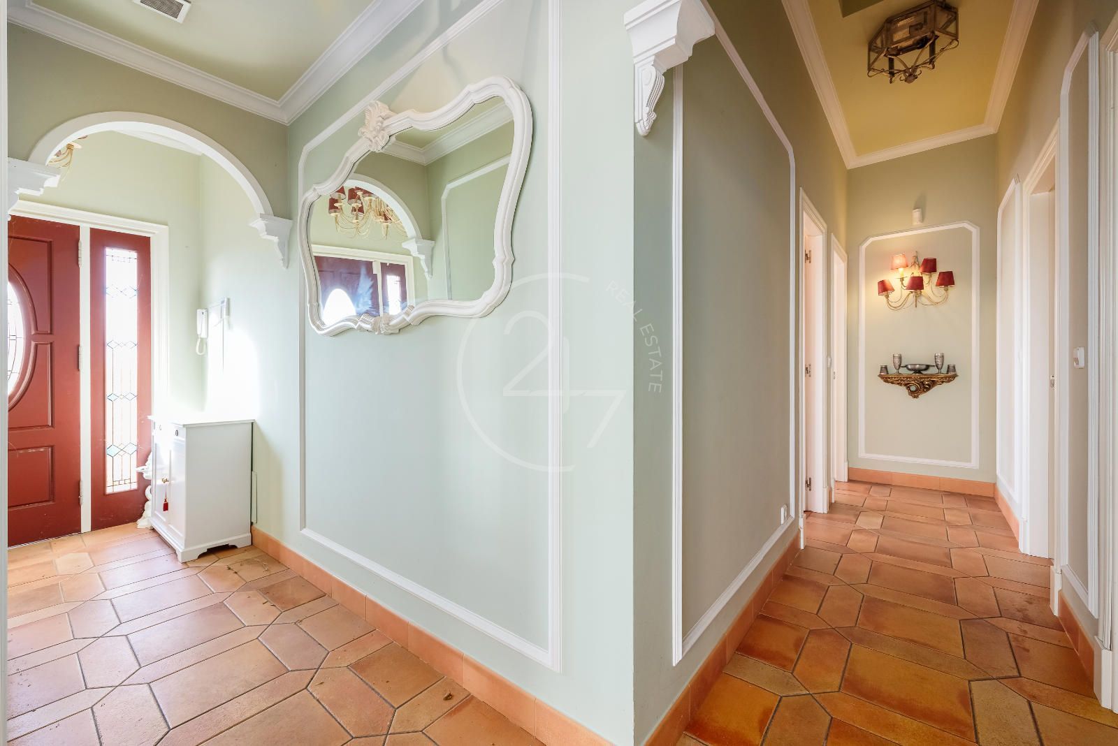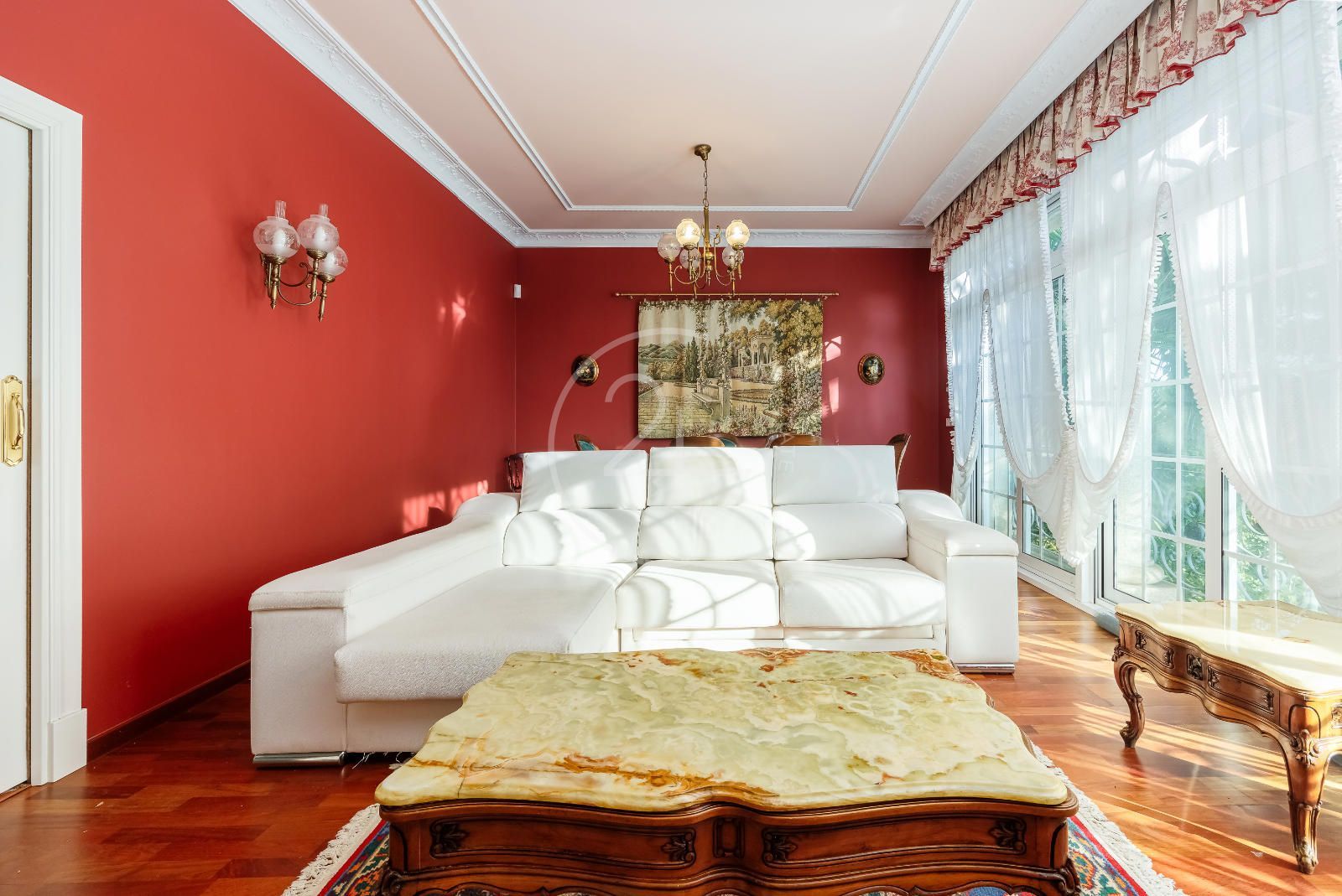La entrada se realiza a través de un acceso automático que conduce al garaje en la planta semisótano y a un cuidado porche delantero que da la bienvenida a la casa. Una vez dentro, el recibidor conecta con un elegante salón comedor de estilo inglés, que destaca por sus techos altos, una chimenea central y amplios ventanales orientados al campo, creando un ambiente cálido y luminoso durante todo el año. La zona de día se complementa con una práctica cocina comedor, que dispone además de acceso directo a la zona ajardinada, ideal para disfrutar de reuniones familiares al aire libre.